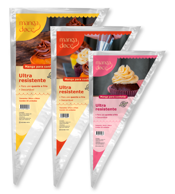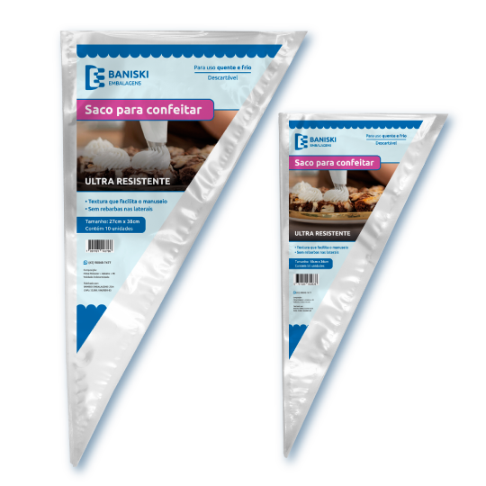 Saco produzido com plástico virgem transparente, apropriado para alimentos. Com solda reforçada. Para uso genérico em processos de confeitaria profissional ou amadora (decorar, rechear, confeitar).